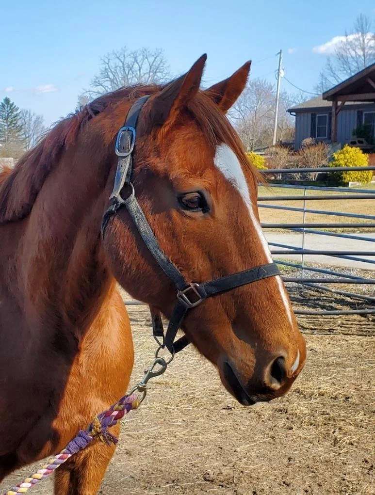 Henny is a 12 year old Thoroughbred gelding who has raced and been a successful show jumper. When he arrived at the farm, he was underweight, had bad teeth, bad feet, and ulcers. He has since plumped up and had all of his medical needs met. He is just a big lug that wants to know what’s going on around the farm.